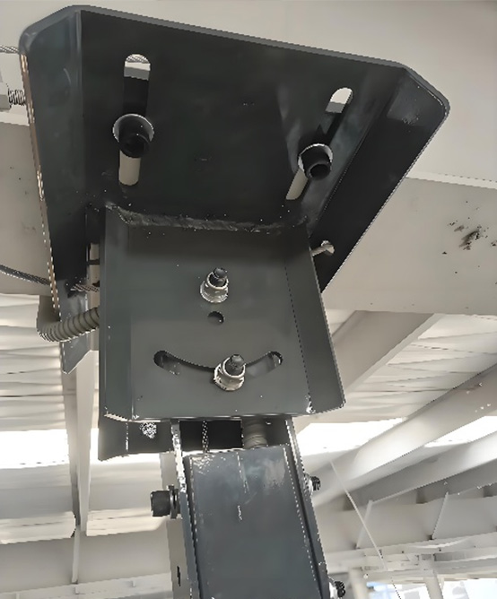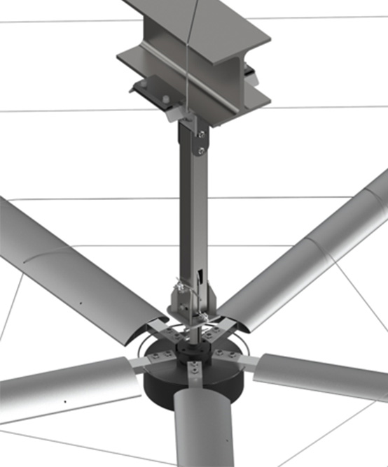 现场施工时,超大吊扇的安装板要贴合在工字钢下翼板上,工字钢厂房的横跨梁都设计有一定的倾斜度,但是因为工字钢本身的平整度,或者施工的原因,下翼板在宽度方向也存在倾斜现象,但是超大吊扇的安装板只能调节一个方向的倾斜,另外一个方向的倾斜只能在机架位置调节,现场经常发现超大吊扇的连接吊杆在一个方向是倾斜的。
