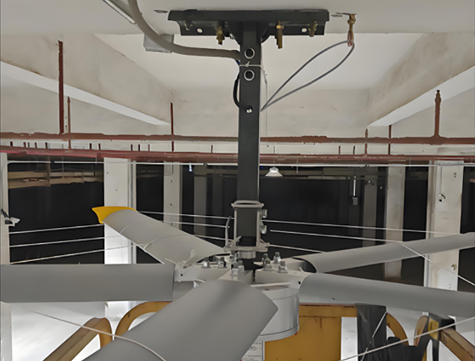 轻质款风扇允许安装在平面的天花板上,这种安装方式将安装板贴合在天花板上,膨胀螺栓垂直打入天花板,风扇转动产生的扭力通过吊杆和安装板直接传递到膨胀螺栓上,长时间运转后可能导致膨胀螺栓松脱,风扇坠落。