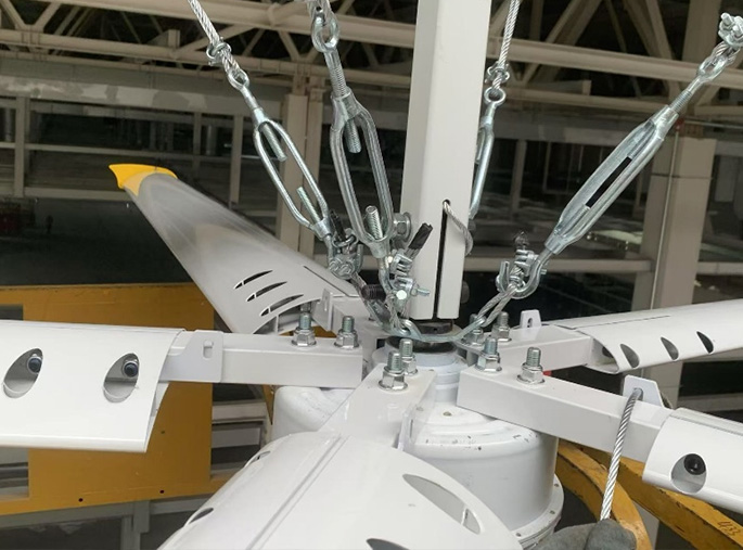 基于14年真实的超大吊扇的维修维护工作建议,经历过相当数量铝合金挤压叶片的断裂事故及原因分析,我们发现,99%的断裂事故都是发生在叶片根部紧固螺栓的部位,而且这些螺栓对叶片和叶柄/卡夹的紧固方式都是上下贯通叶片壳体,实际观察叶片的螺孔部位被螺栓螺纹切割,螺孔扩大,引致断裂。